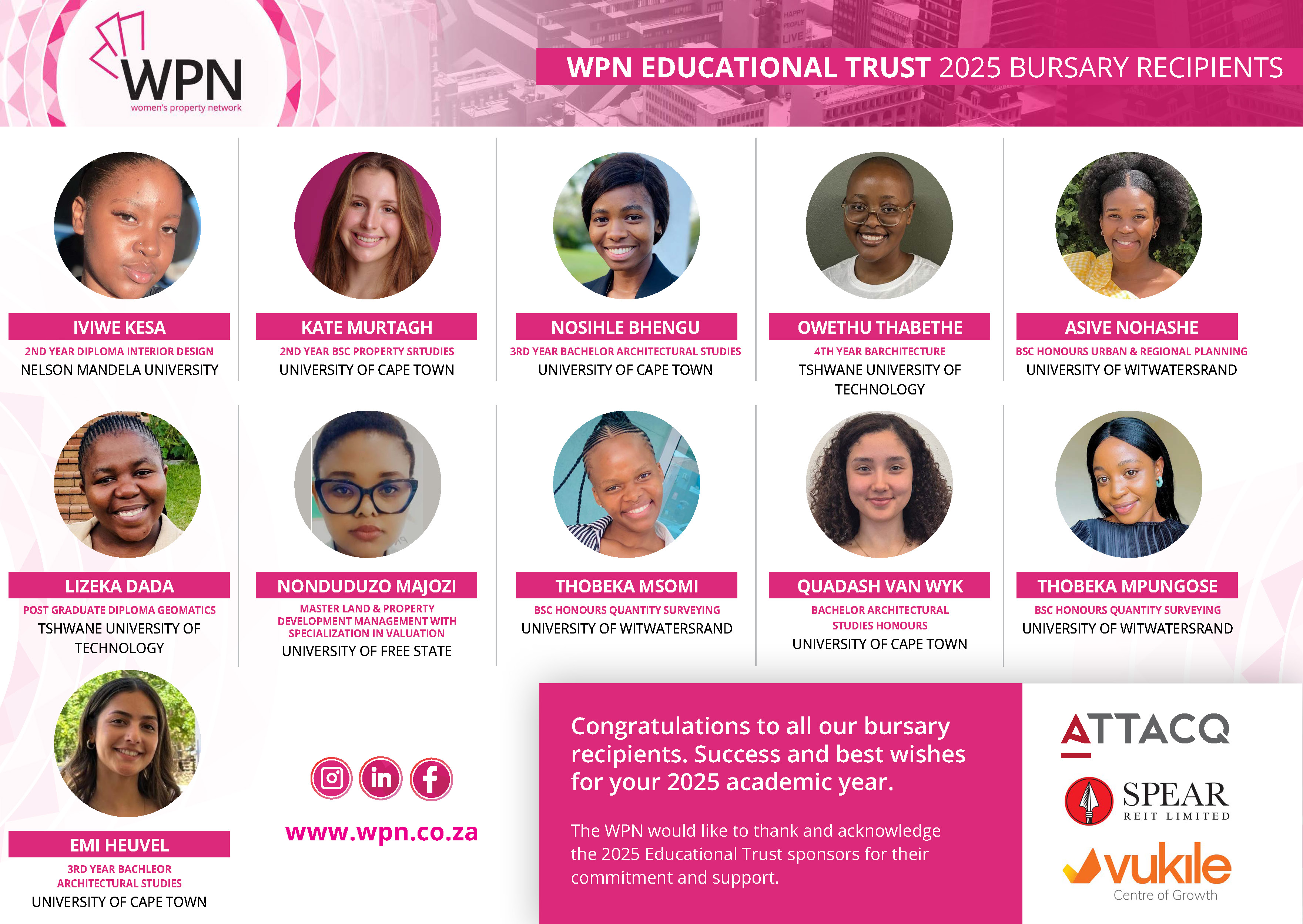 Through our Educational Trust, WPN strives to offer bursaries to previously disadvantaged female students studying towards a property related degree or diploma.